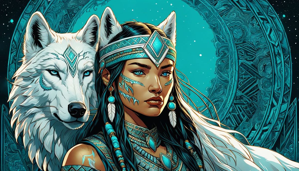 This image shows a Native American warrior goddess accompanied by a white wolf with glowing blue eyes. The digital painting features vibrant turquoise patterns and golden hour lighting in a comic book style.