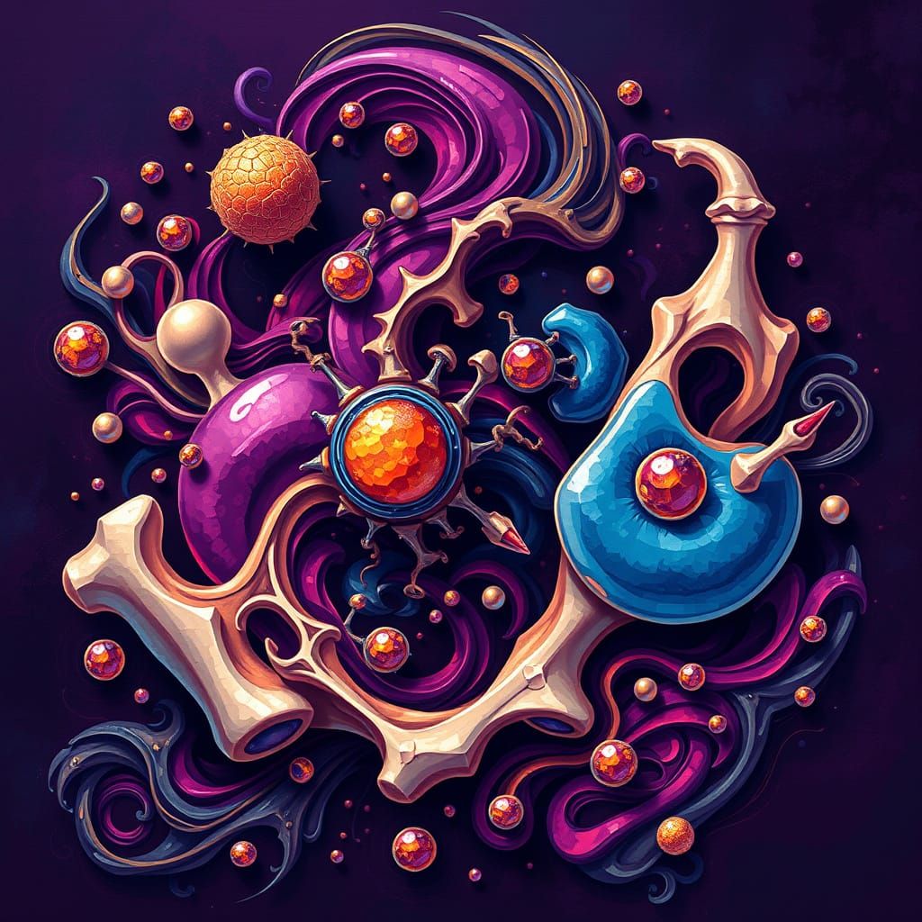 This stunning pixel art image showcases a vibrant, abstract representation of estradiol, blending organic and inorganic elements, with bold lines and jewel-toned colors, set against a rich background featuring fragmented bone structures and smooth pouch shapes, reminiscent of surrealist dreamscapes and h...