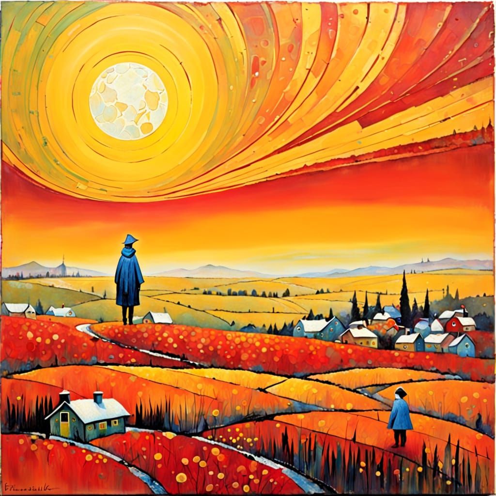 This image is an encaustic painting with a primitive and naive style. It features rich textures and vibrant colors, inspired by the artistic approaches of Hundertwasser and Lisi Martin.