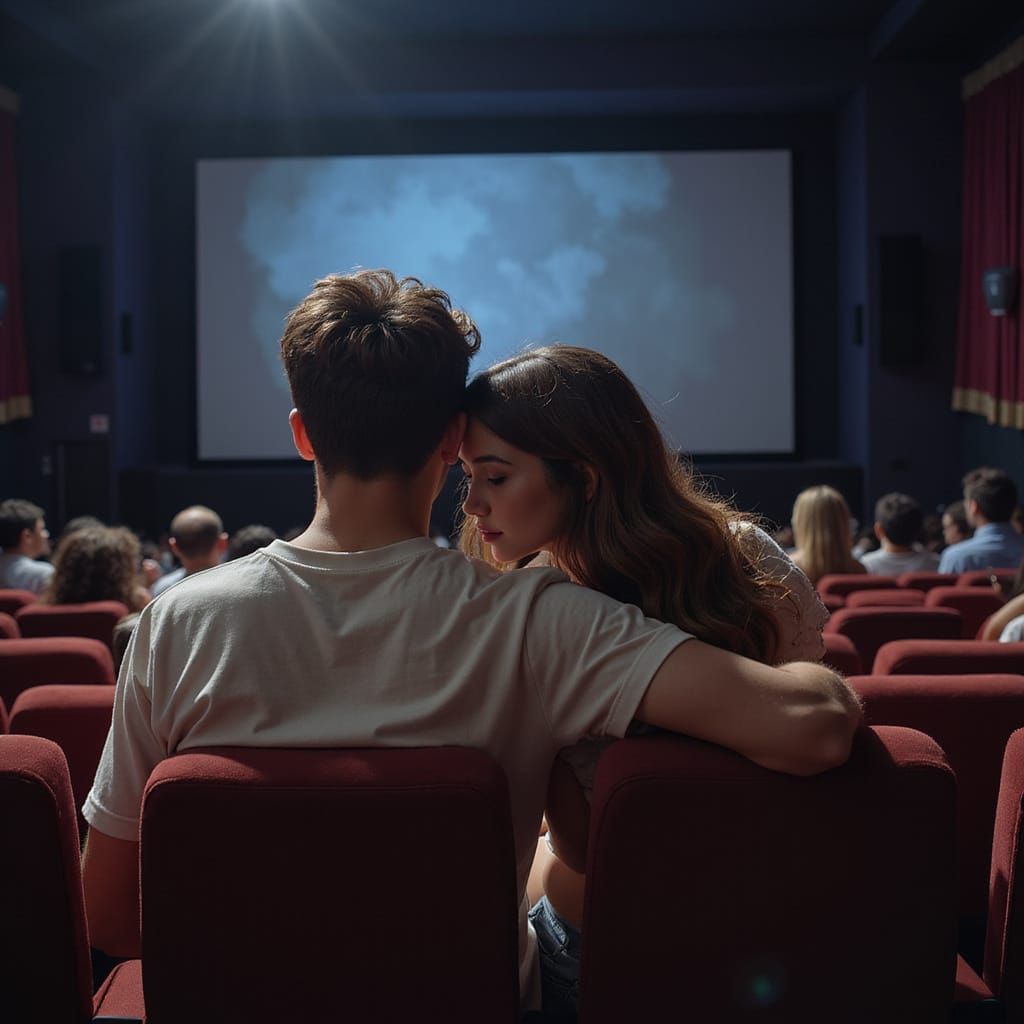A softly lit cinema scene shows a man watching a movie as a woman leans towards him. The image evokes classic pin-up art with smooth textures and radiant lighting.