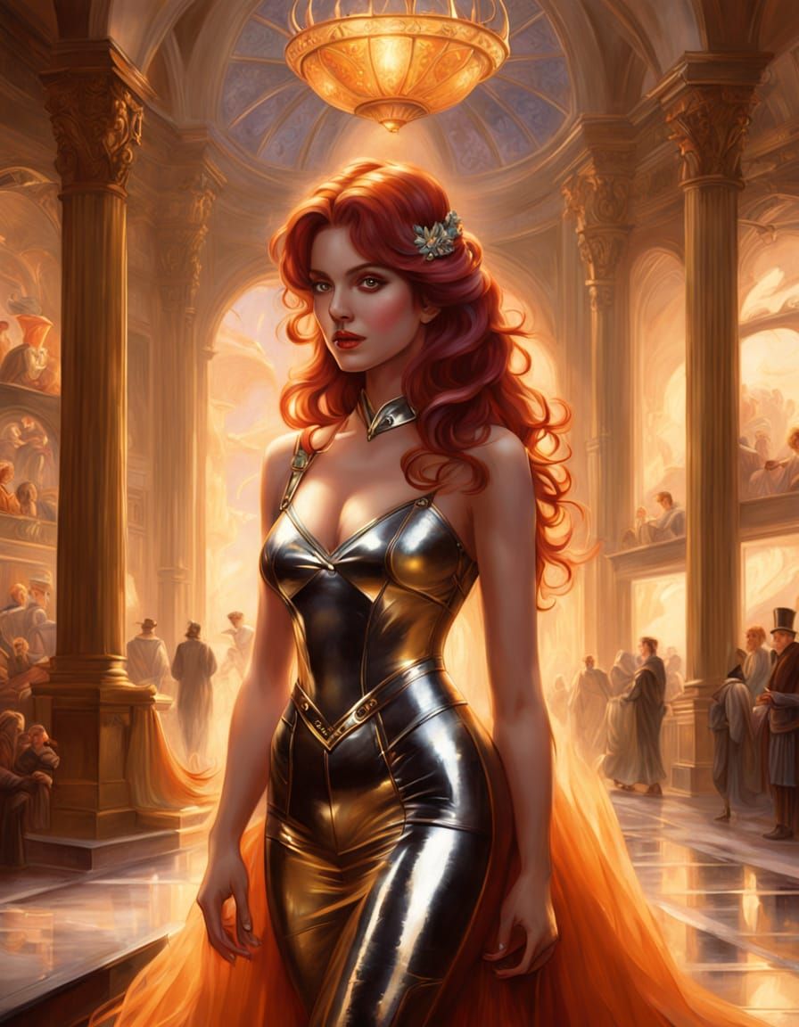 A woman clad in a form-fitting black latex bodysuit stands against a backdrop of sleek marble surfaces. The suit's high-gloss finish reflects light, accentuating every curve and contour of the figure's physique. Straps made of bright orange material crisscross over the bodysuit, tightly securing the ...