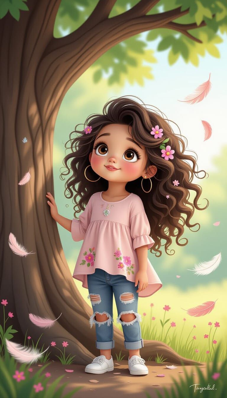 A whimsical young girl with sparkling eyes and curly hair stands by a giant tree, looking up in wonder. Soft feathers float around her in this enchanting scene.