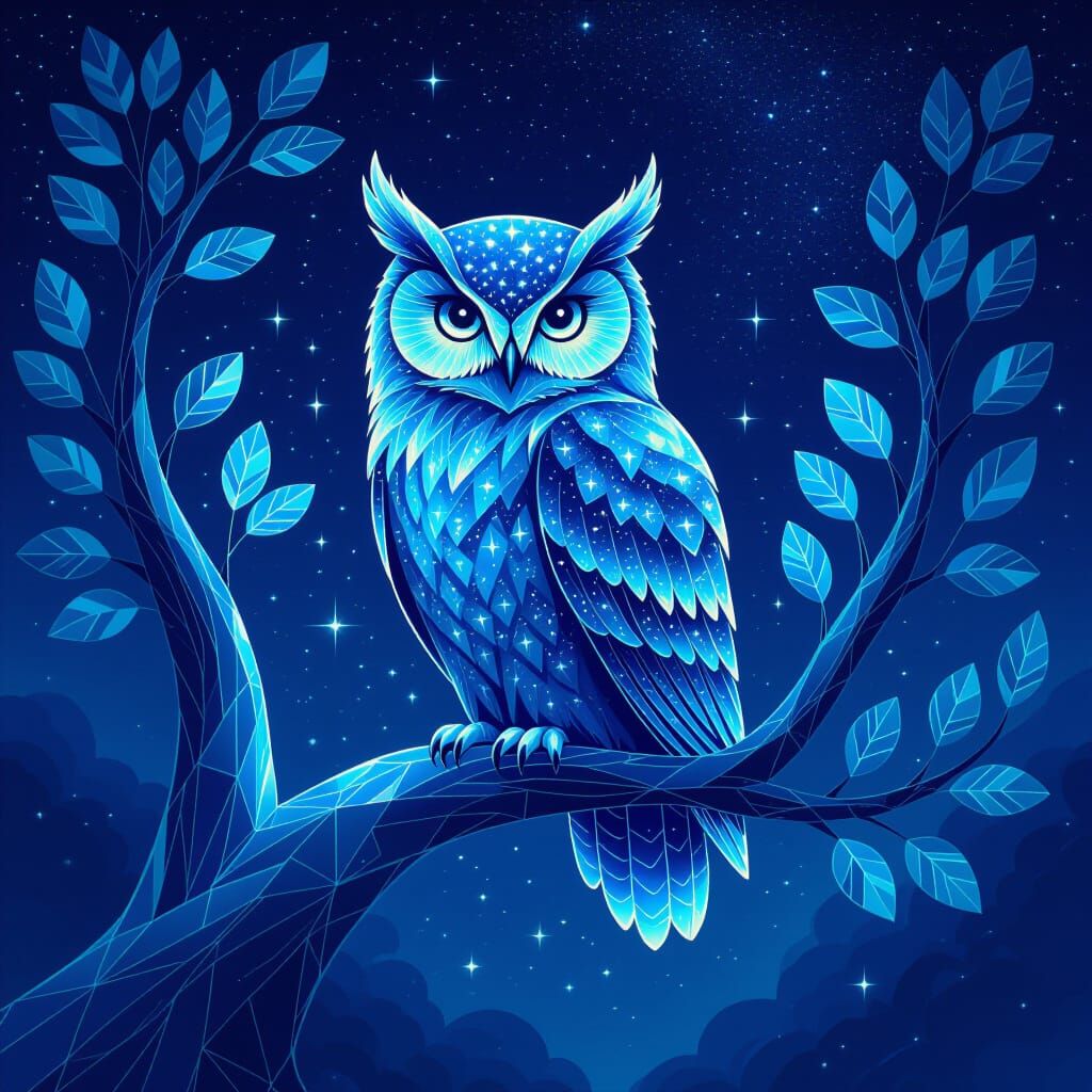 A striking picture of a glowing owl with constellation-like feathers sitting on a crystal tree. The artwork features a swirling galaxy background and a fantasy illustration style with geometric patterns and vivid colors.