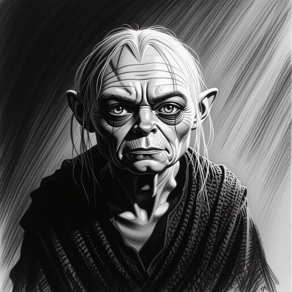 This is a detailed black and white charcoal portrait of Gollum from LOTR. The image features dramatic shadows and high contrast, capturing a stern expression and textured robes.