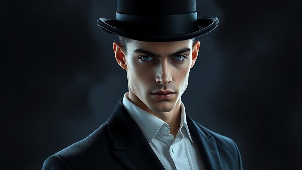 This image captures the essence of an otherworldly ruler, exuding elegance and mystique in an ethereal black suit and top hat. His striking features and piercing blue eyes command attention, set against a flawless ivory complexion and razor-edged hair. A masterpiece of photorealistic digital art, evoking...