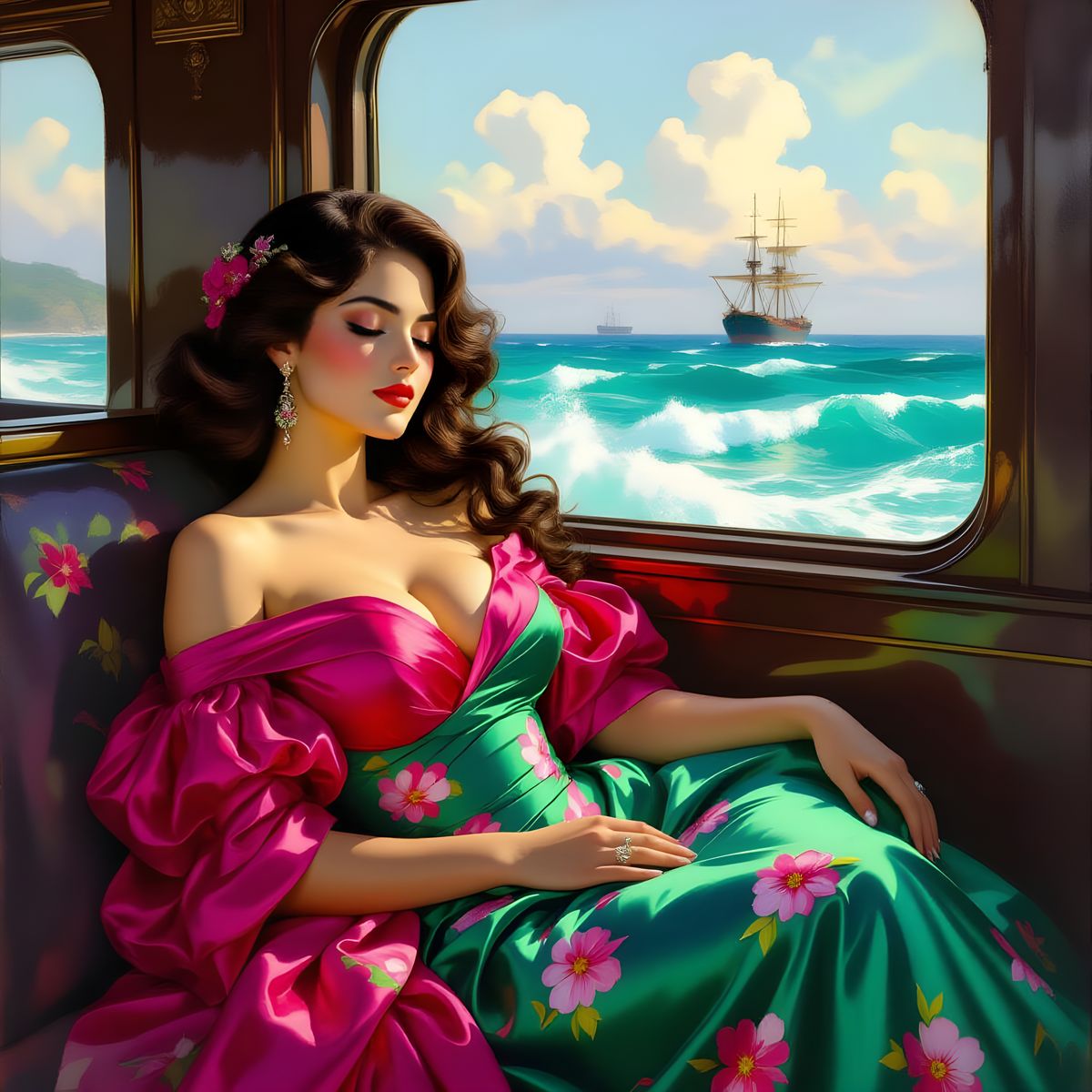 This image shows an alluring, full-figured Italian princess asleep on a train seat adorned with blossoms. She overlooks crashing turquoise sea waves and a distant old ship.