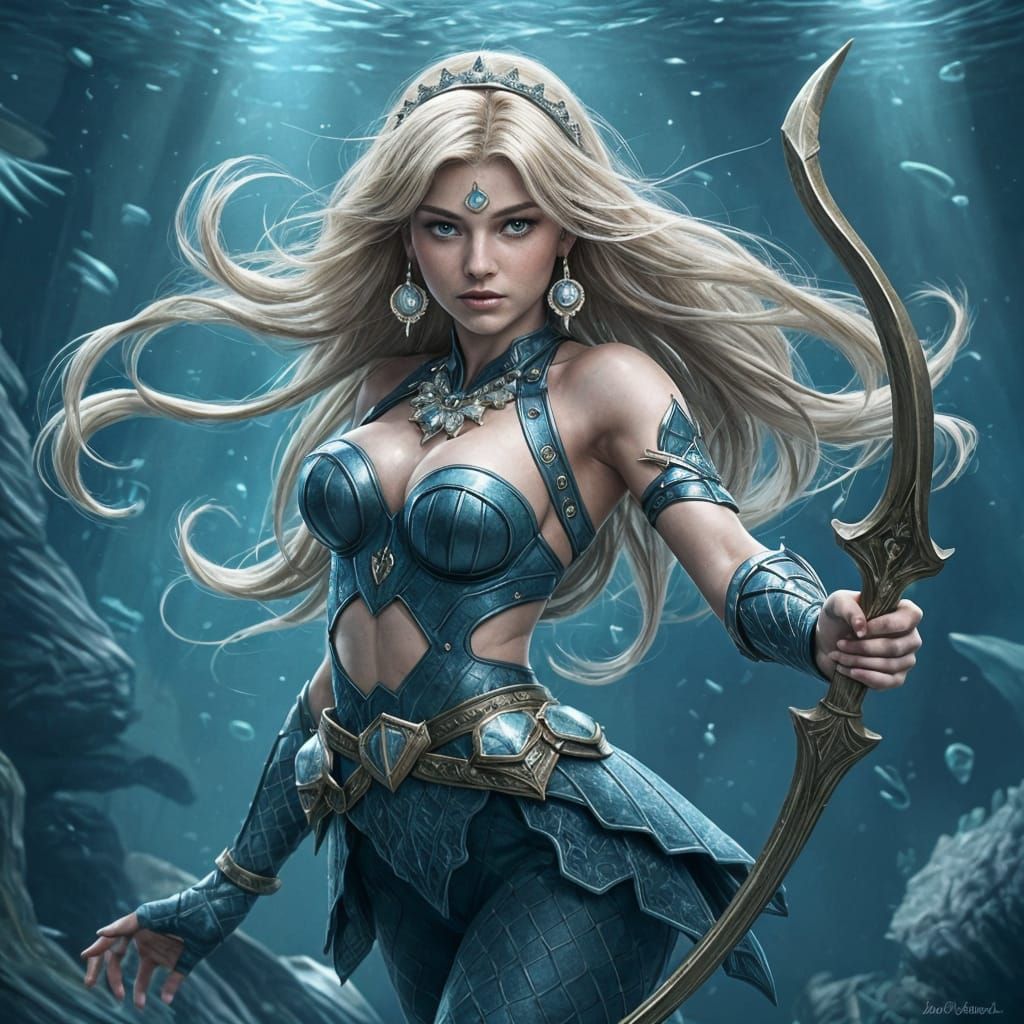 A digital painting of Pearl, a mermaid warrior. She is armored and carries a bow and arrow. The underwater environment is richly detailed with dynamic lighting, creating a sense of depth.