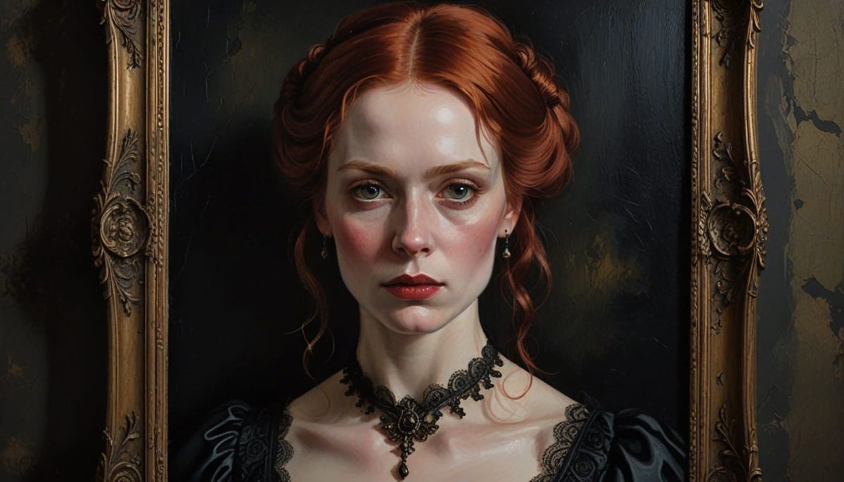 A captivating oil painting of a gothic Victorian woman with red hair and pale skin. The portrait is framed by an ornate, hand-carved oak wood frame, set in dark elegance.
