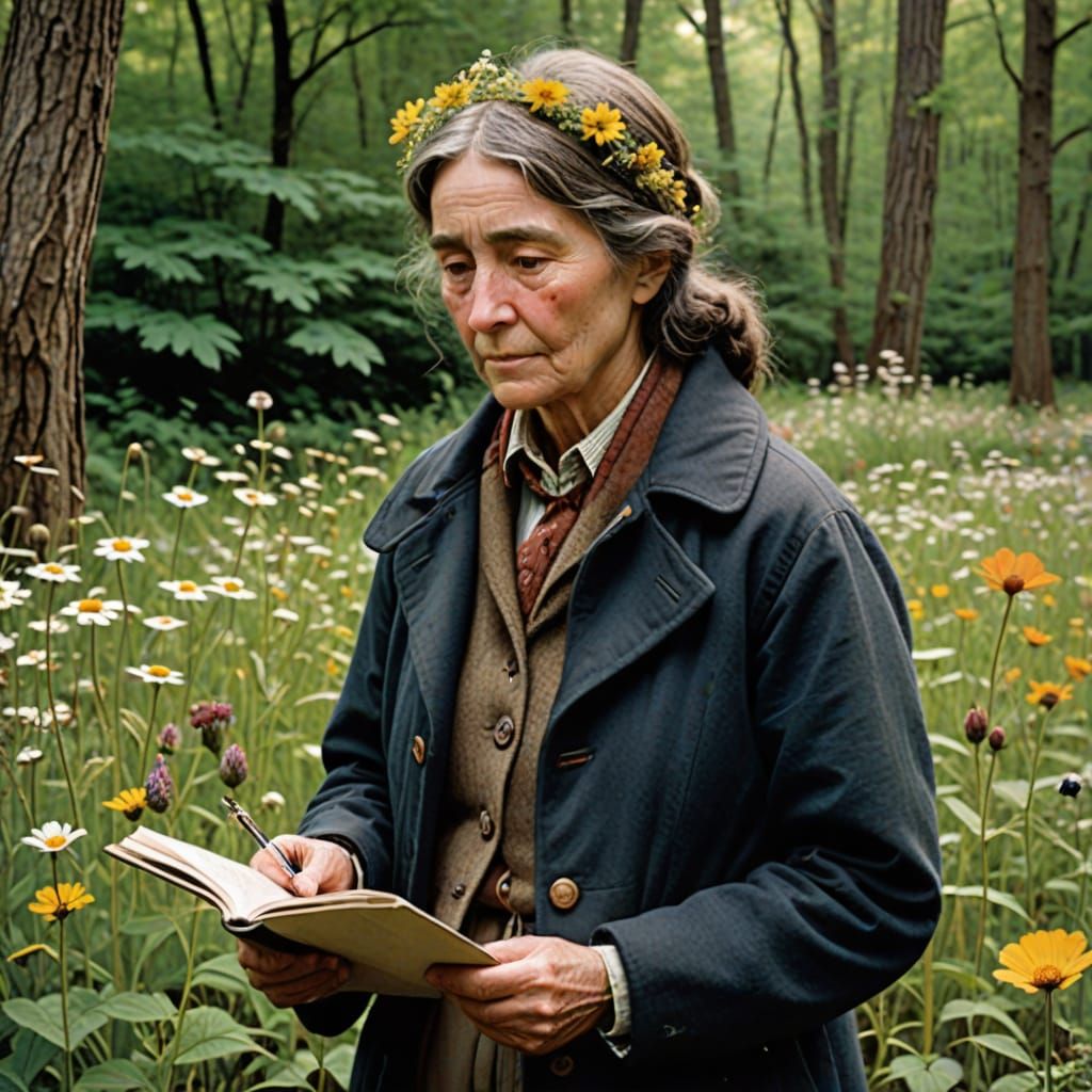 This image depicts a young woman, a wildflower in her coat, writing a letter. It evokes a 1970s aesthetic, hinting at themes of peace, protest, and personal reflection.