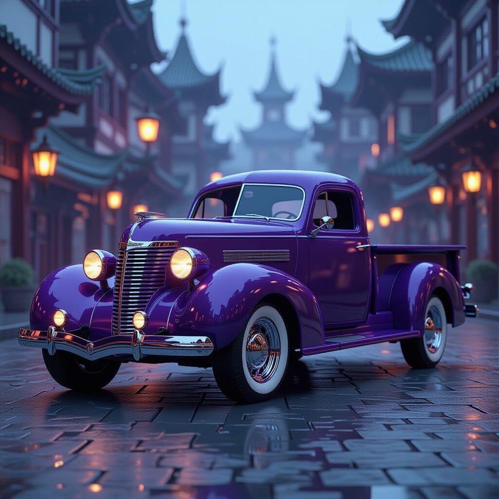 This image displays a dark fantasy concept art of a Chevrolet trident, featuring intricate details, deep colors, and dynamic lighting. Rendered in 8k resolution with a purple and yellow palette.