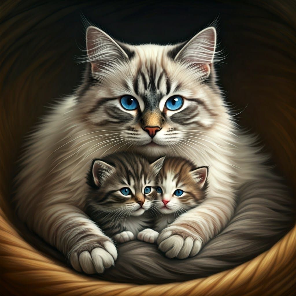 This heartwarming image shows a serene gray-blue tabby cat surrounded by two adorable kittens, their tiny faces pressed together in a tender bundle of fur, evoking a dreamy, whimsical atmosphere reminiscent of classic children's illustrations.