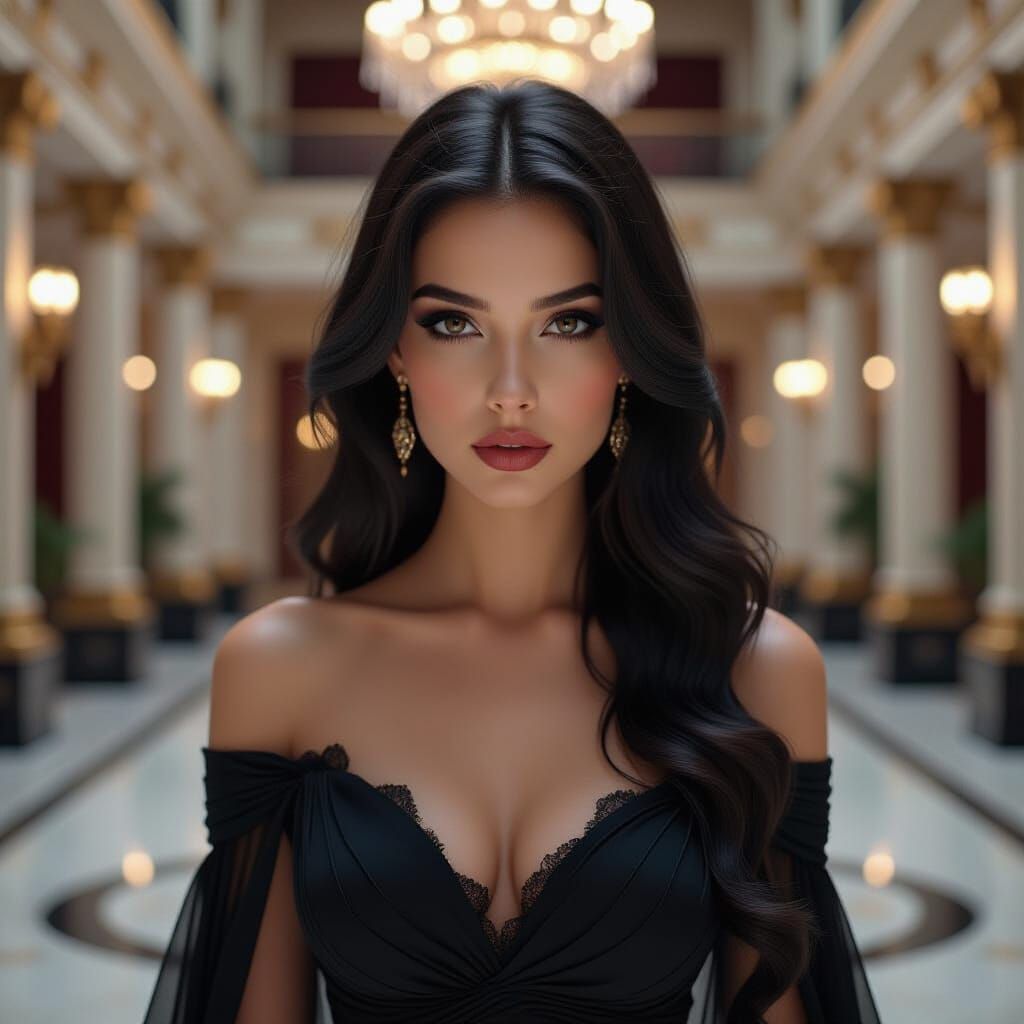 A mesmerizing beautiful scene of a close up portrait of a 23 years old, gothic woman standing in the opulent hole of a magnificent theatre. The woman, with dark hair and alluring eyes, wears a flowing ephemeral black dress, evoking an elegant aura.,