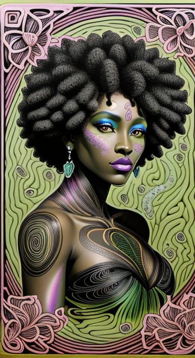This image is a striking fusion of traditional and digital art, featuring a medusa-inspired fairy with an afro, set against a cherry blossom orchard background, created using a unique blend of oil slick colors and zentangle techniques.