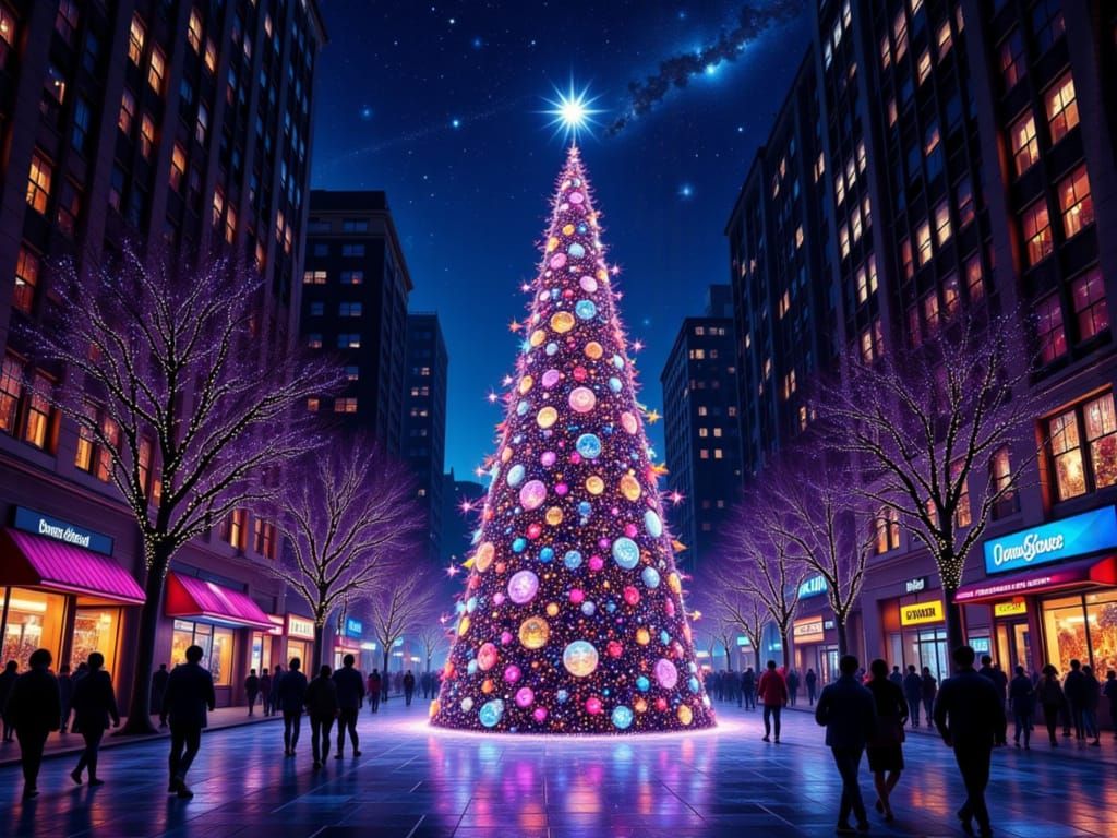 A stunningly realistic and detailed image of New York City's largest Christmas tree, ablaze with multicolored lights that illuminate the entire neighborhood and bustling passersby.