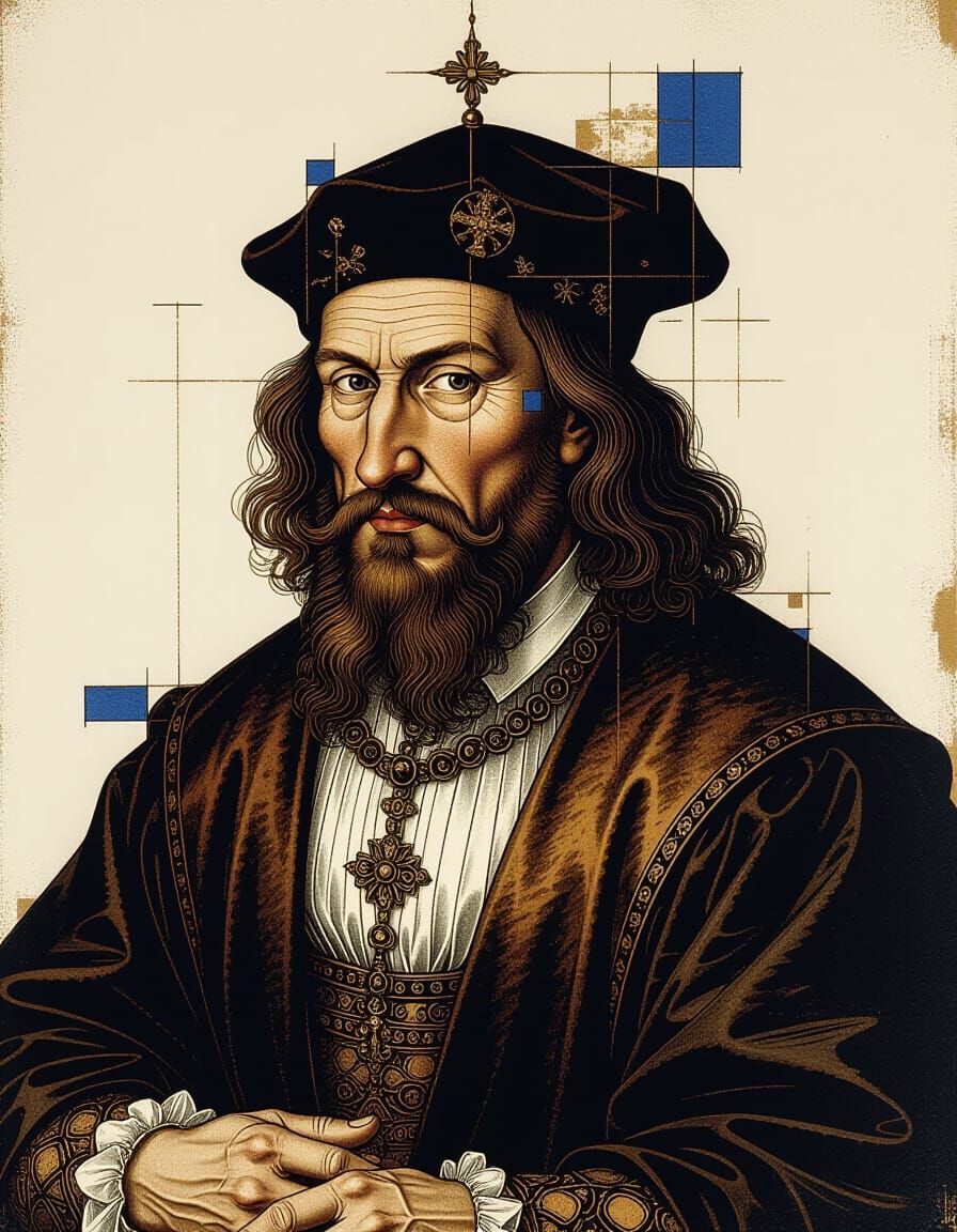 A surreal image blending Renaissance engraving with digital glitch art and industrial design. The artwork employs gouache and watercolor techniques to create impasto textures and transparent layers.