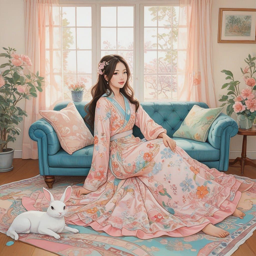 可爱超美的亚洲华侨女神,在自己的优雅高贵的客厅 靠近的兔很很开心!Dreamy quality of Takashi Murakami's anime-inspired art, the delicate, lacy patterns of Audrey Kawasaki's woodblock prints, and the soft, feathery textures of James Jean's watercolor illustrations.