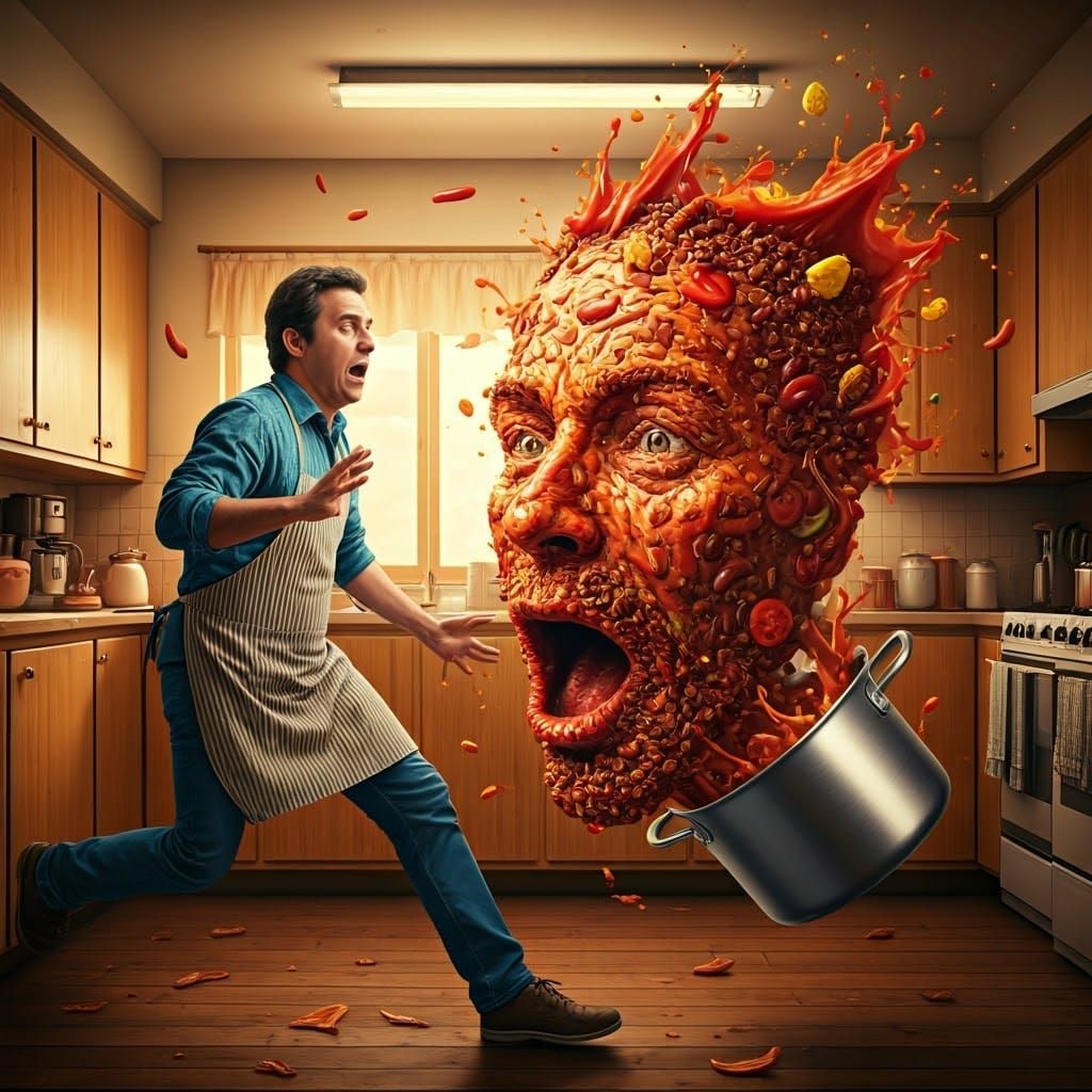 This image shows a chaotic kitchen scene with a dramatic food splash forming a haunting human face. A family meal gone wrong, with a pot of chili con carne falling mid-air, surrounded by disorganized counters and retro decor.