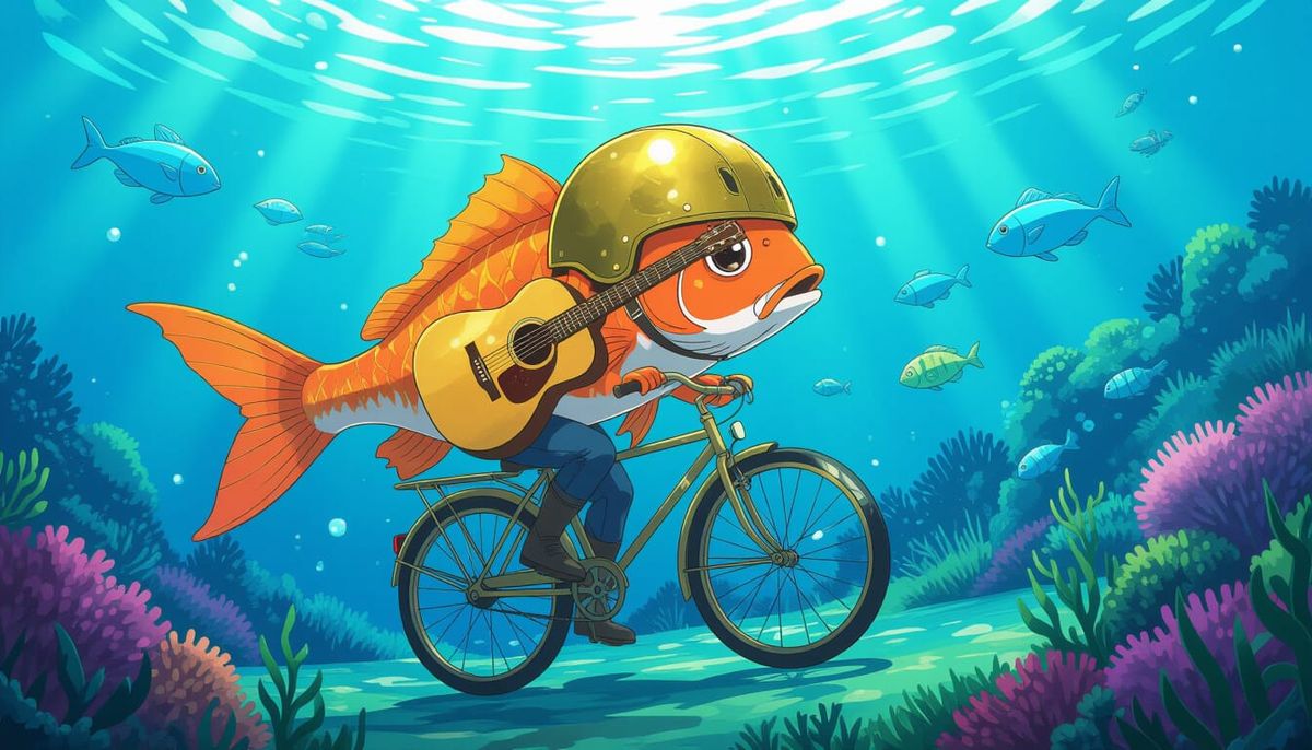 This image shows an anthropomorphic fish in a vintage helmet, cycling underwater with a guitar. Rendered in a vibrant Anime Key Visual style with dynamic lighting and detailed flora and fauna.