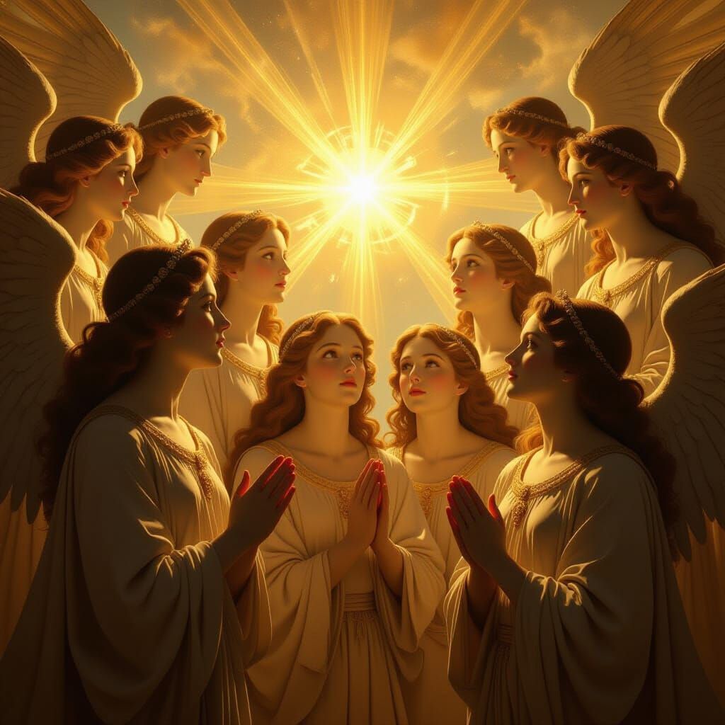 This image shows a divine assembly of angelic figures whose forms are covered in eyes, watching all of existence. Rendered in a dramatic classical baroque style with rich textures and golden light.