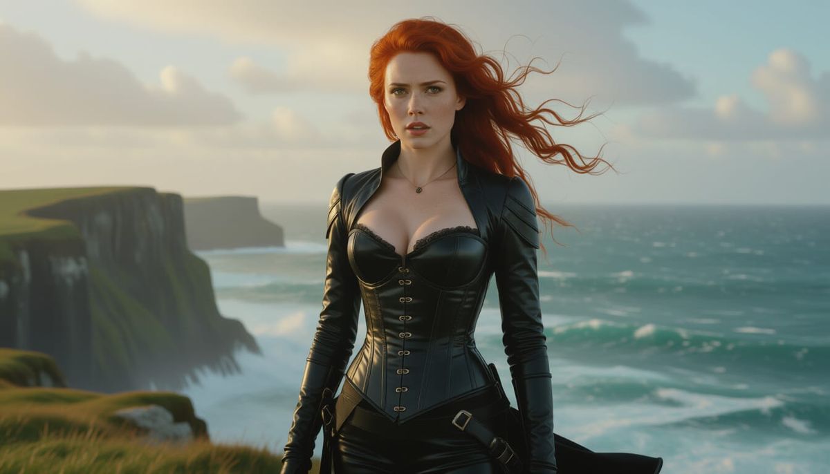 This image shows a red-haired woman in a leather corset standing on a cliff. She has an anxious expression as she looks out over a stormy sea in this photorealistic digital artwork.