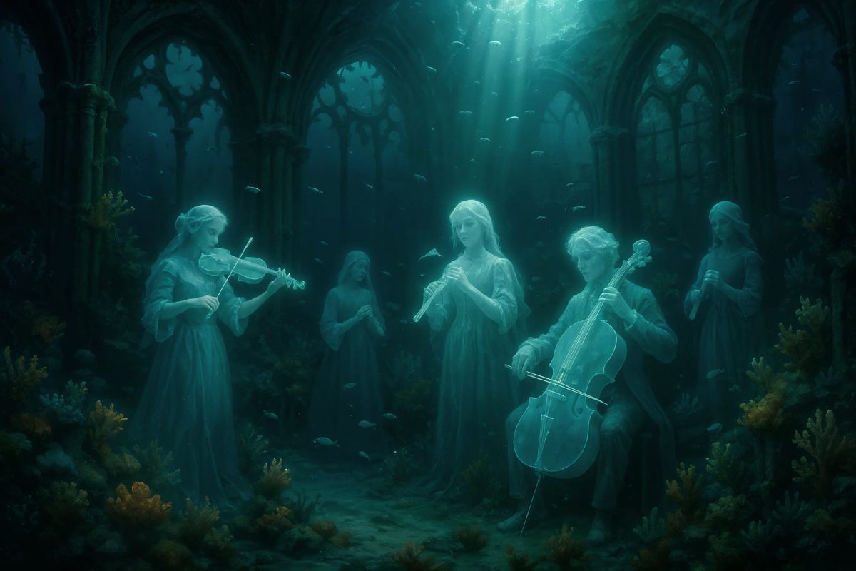 A digital painting depicts a sunken cathedral reclaimed by the ocean. Ghostly figures in historical clothing play luminous instruments among coral and marine life, illuminated by shafts of light in this haunting scene.