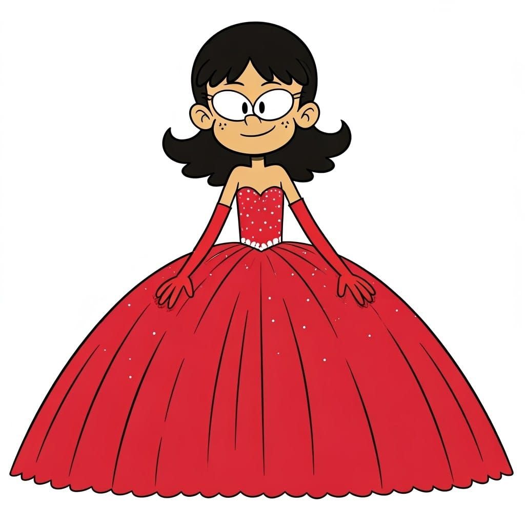 The Loud House Cartoon Style: 12 year old skinny Stella Zhau with black hair wearing a long large wide floor length red tulle Sleeveless poofy gown in a dome shape. The dress has a sweetheart neckline and is embellished with rhinestones. She is also wearing long red gloves.