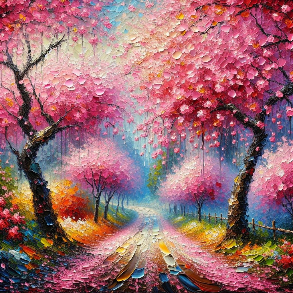 This image showcases a scenic road lined with cherry blossom trees in full bloom, their vibrant pink blossoms dispersed by a gentle gust of wind, creating a beautiful 'cherry blossom rain' effect, amidst a richly colored and textured impasto oil painting.