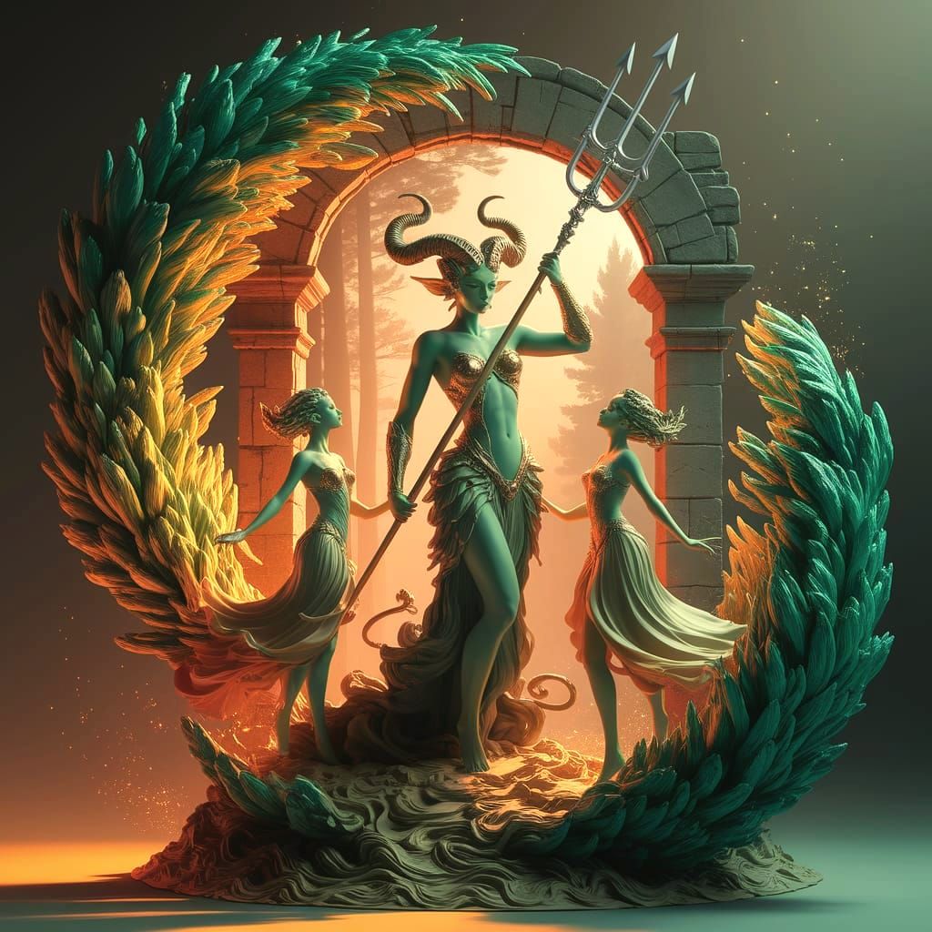 This digital art sculpture showcases a powerful green-skinned figure with horns holding a trident, flanked by smaller enchanting figures amidst foliage. Rendered in an Art Nouveau style with warm, mystical lighting.