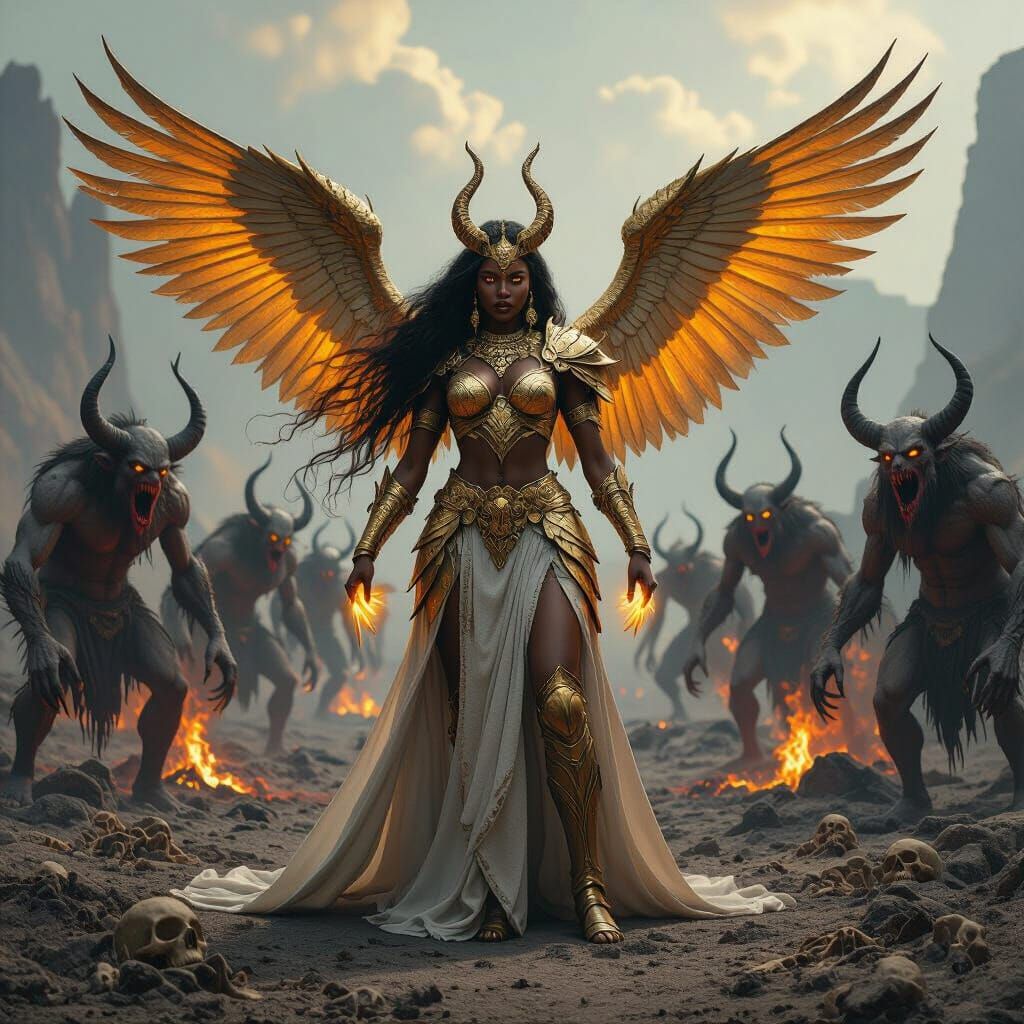 A divine warrior goddess with cosmic hands confronts a terrifying army of horned, fanged monsters in a desolate wasteland. Rendered in hyperrealistic oil painting style with dramatic lighting.