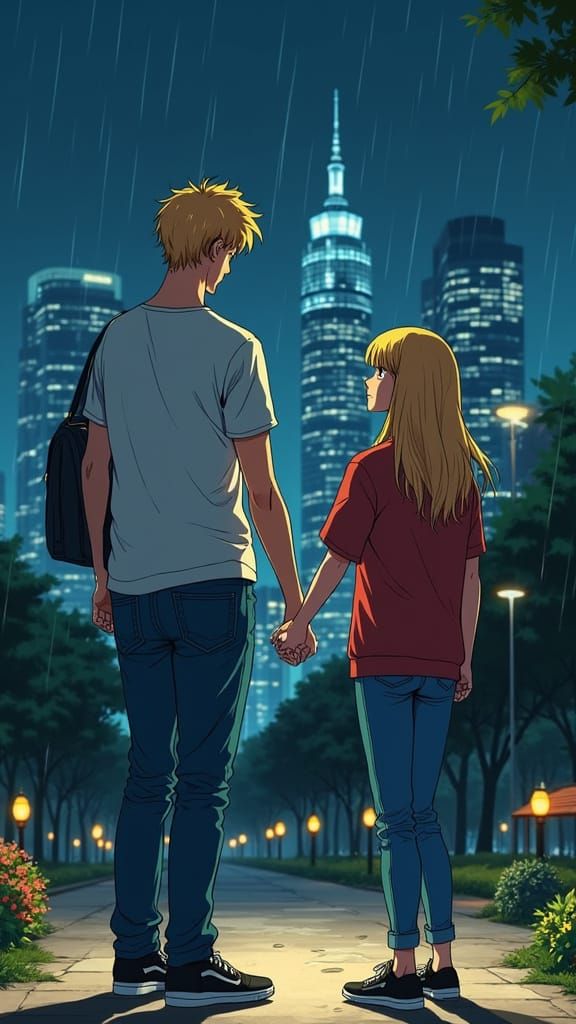 This image captures a romantic moment of a young couple strolling through a city park at night, surrounded by towering skyscrapers and soft lamp light. The vibrant colors and lo-fi aesthetic evoke a sense of nostalgia and whimsy, reminiscent of classic anime styles.