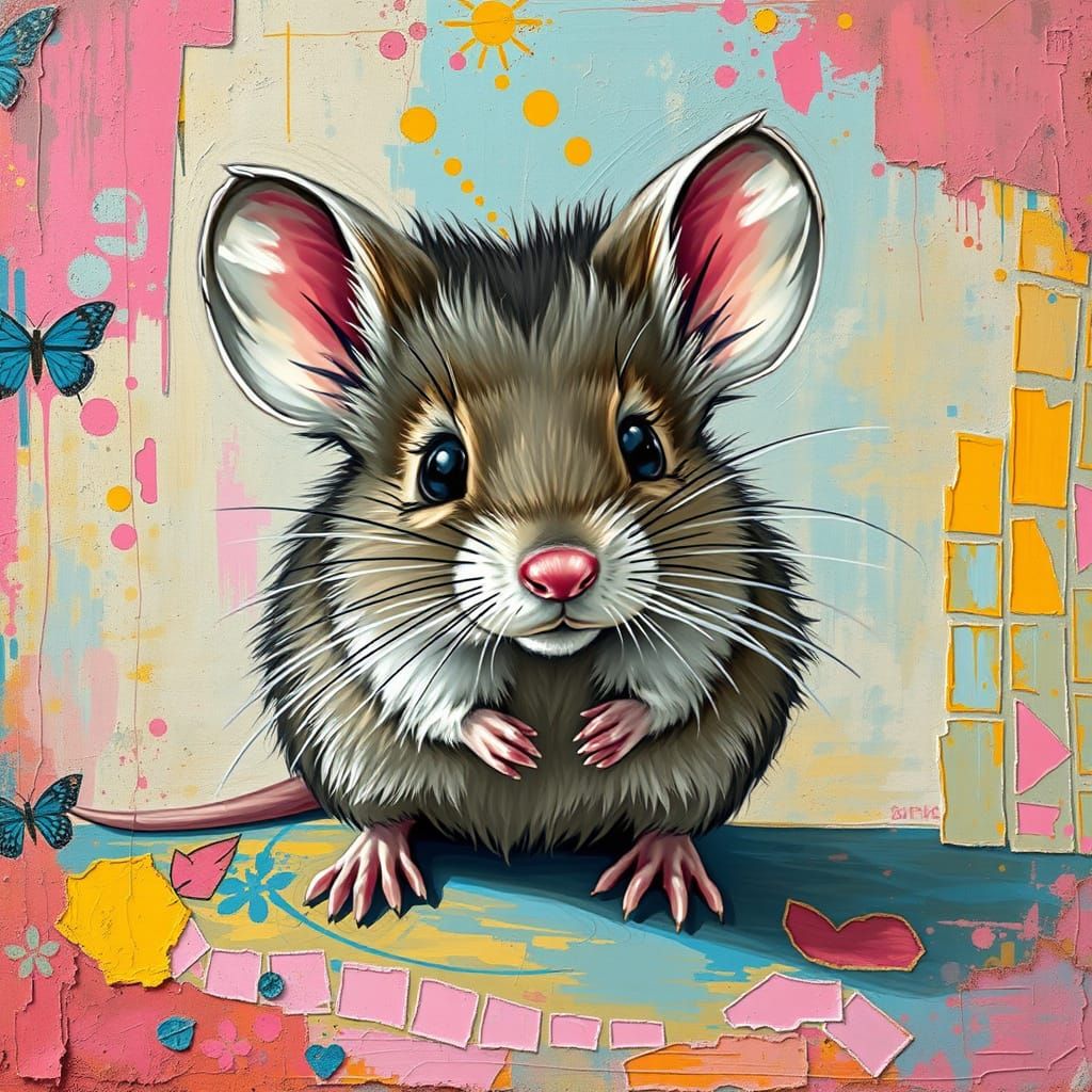 This image showcases a whimsical mouse with textured fur, set against a bold, grungy art deco background in pastel colors, with visible brushstrokes and vivid hues reminiscent of Impressionist and Expressionist art styles.