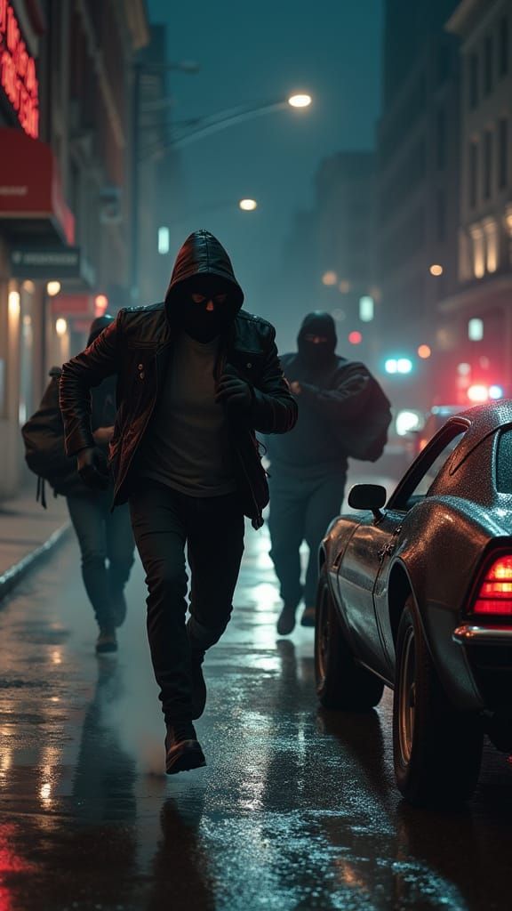 A dynamic scene of masked robbers escaping a bank with money bags, illuminated by flashing police lights on a wet night street. Cinematic action with motion blur.