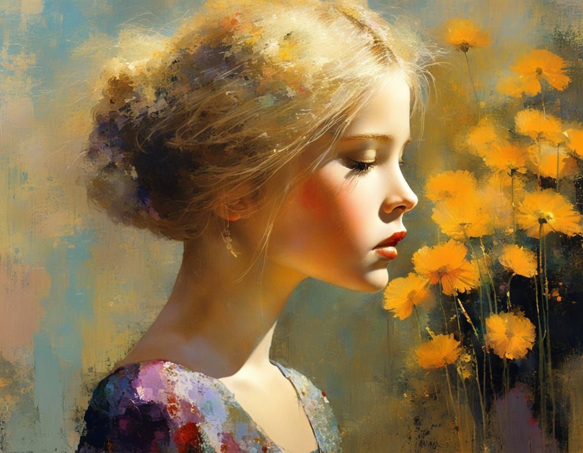 An out-of-focus portrait of a young blond girl with flowers in her hair, bathed in the soft glow of golden hour lighting, evoking a sense of mystery.