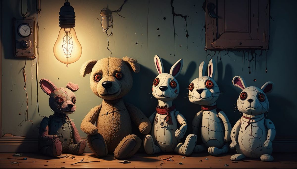 This oil painting captures a group of worn stuffed animals huddled together, appearing to plot under a single bare lightbulb. Moody, atmospheric lighting enhances the unsettling, narrative scene.