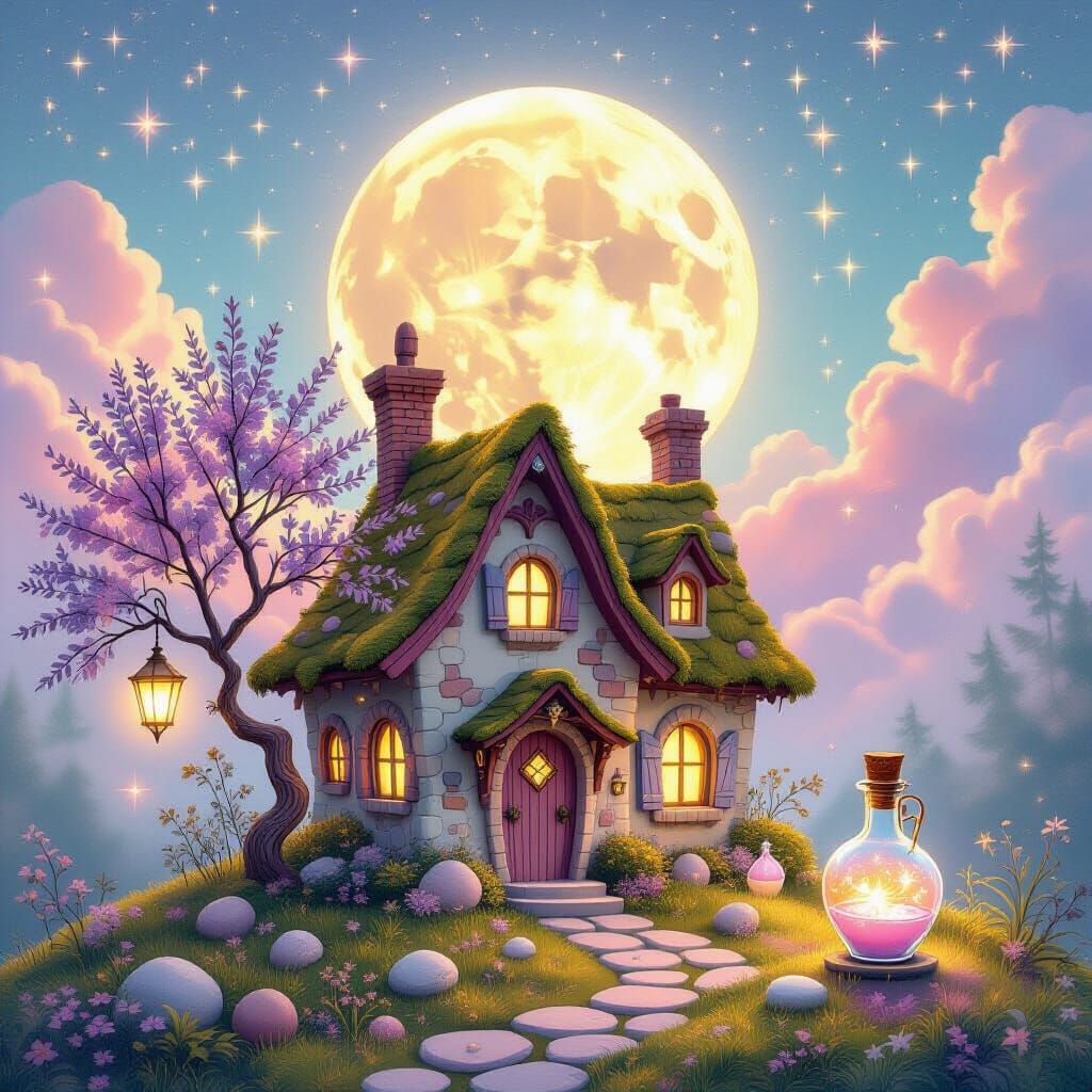 A fairy-tale house sits among moss and lavender trees beneath a giant moon. The image evokes vintage storybooks, with pastel colors and a soft, dreamlike glow in a cinematic style.