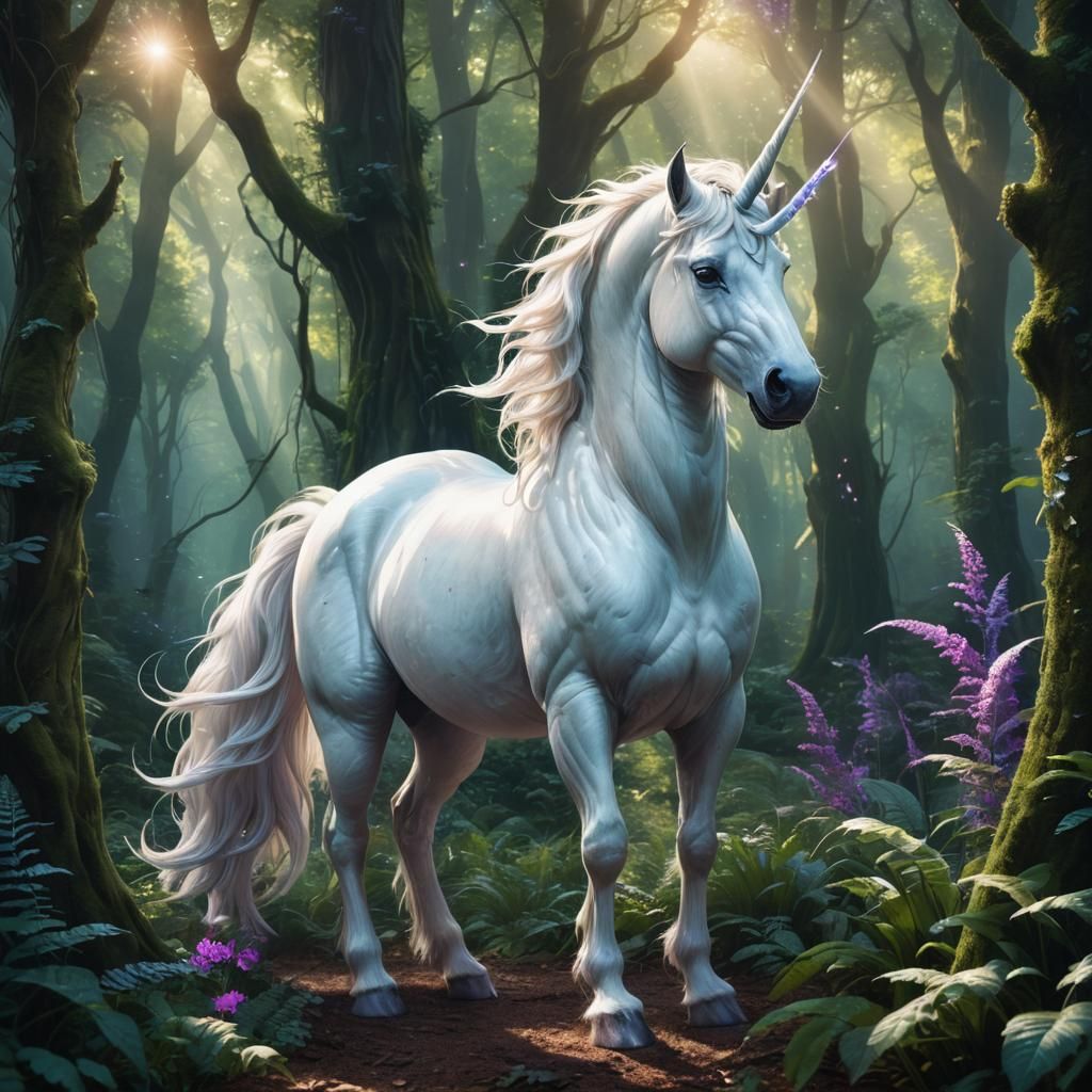 A striking picture of a white unicorn in a vibrant forest. The spiraled horn glows, illuminating delicate foliage. Deep blues and purples create contrast in this ethereal digital painting.