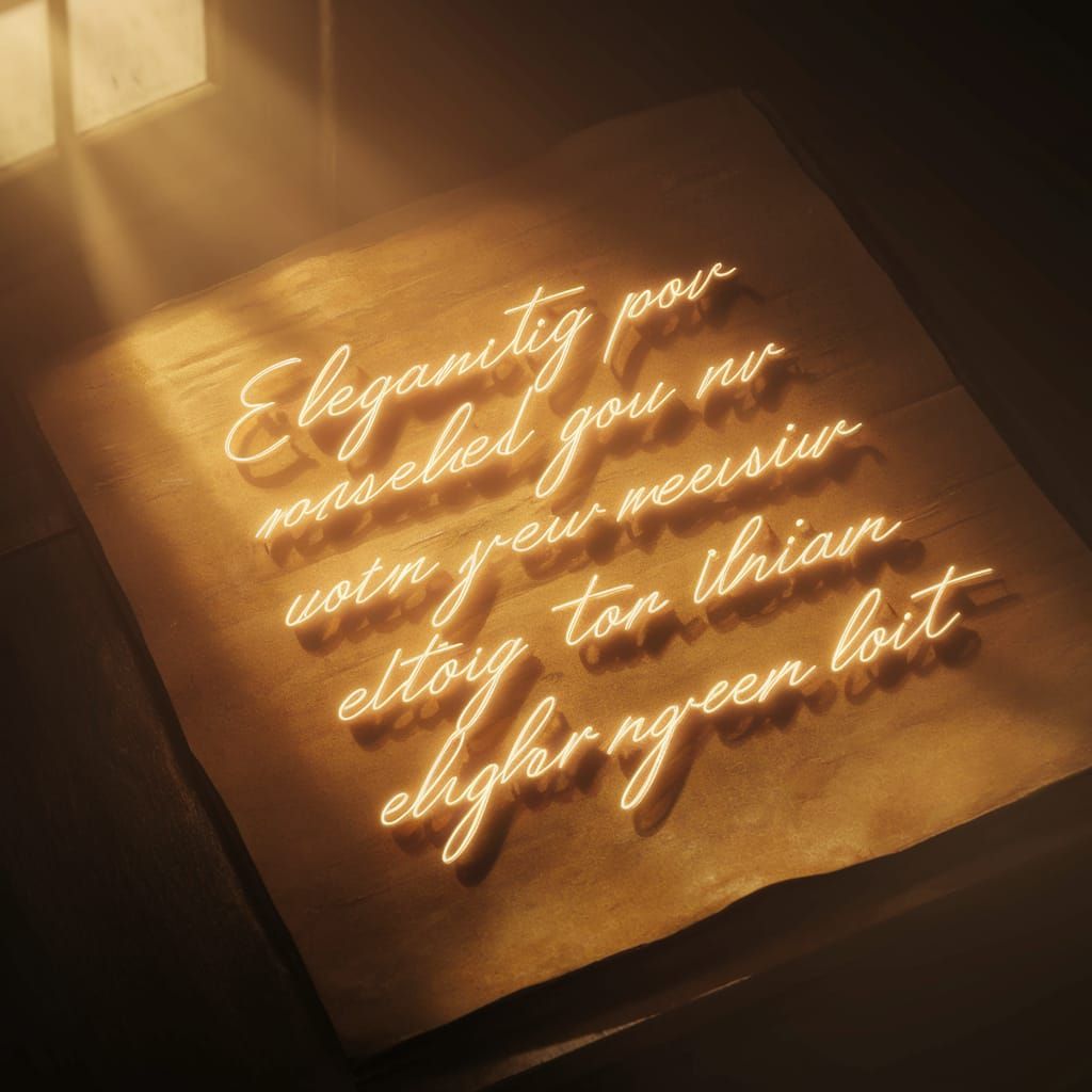 This image captures a vintage scene of elegant poetry written in neon lights on aged paper, blending ancient and futuristic elements in a dramatic display of high-contrast lighting.