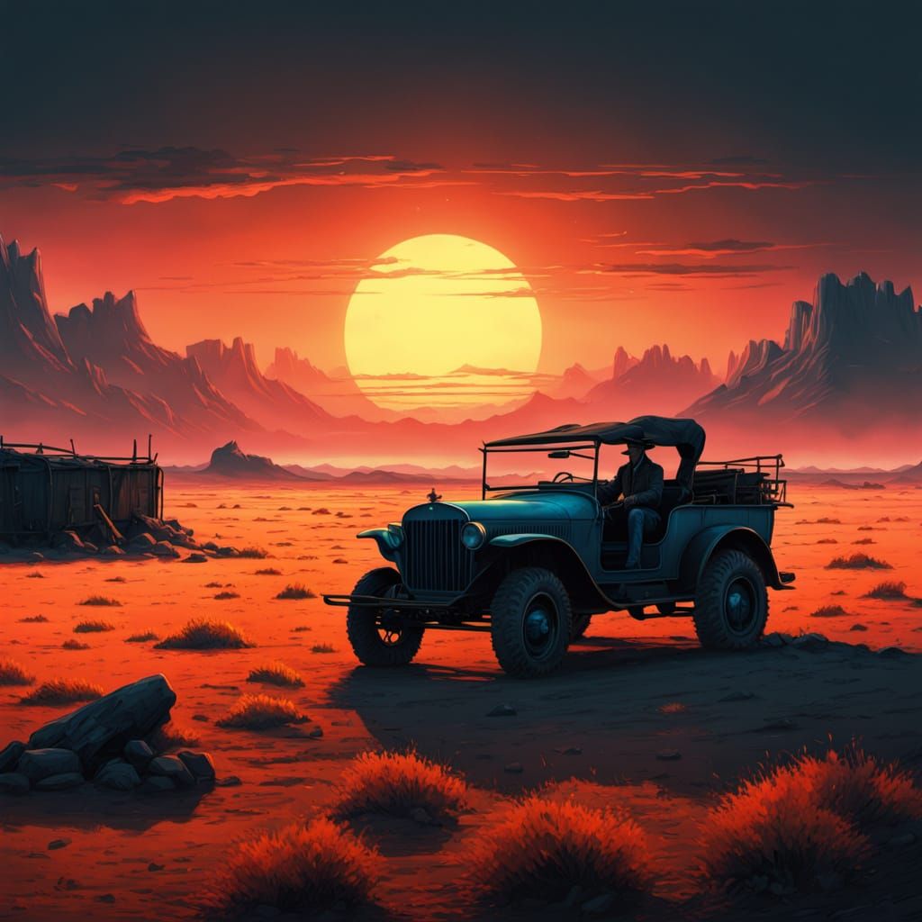 This digital painting captures a determined Spanish Gaucho in a red shirt and cowboy hat, standing by a chuckwagon. Eerie landscapes and dramatic shadows enhance the concept art.