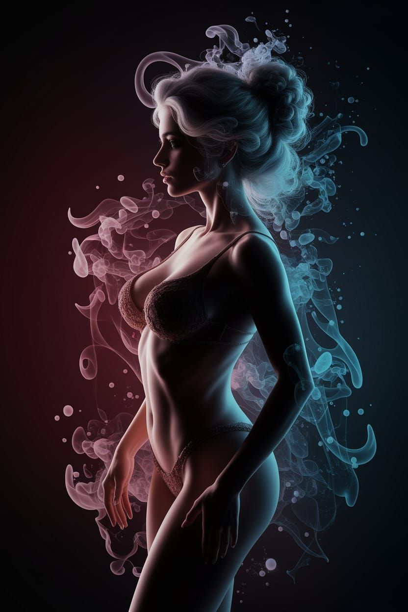 This image shows a smoky silhouette of a curvy woman against a dark noir background. The piece features intricate details, vibrant colors, and dramatic lighting, rendered as splash art.