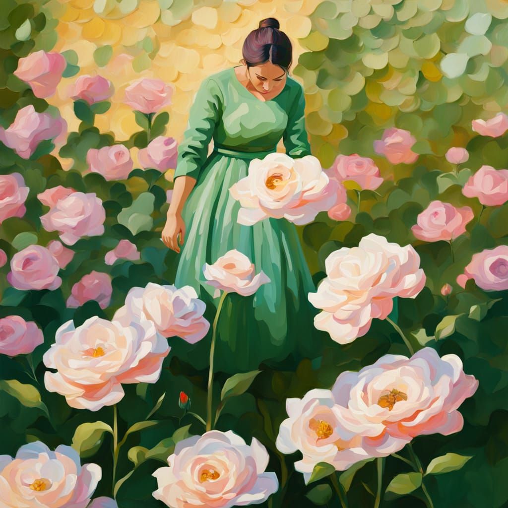 This image shows a woman in a green dress standing in a rose garden. The close-up shot emphasizes the impasto texture and vivid floral patterns, bathed in warm golden light, as a vibrant oil painting.