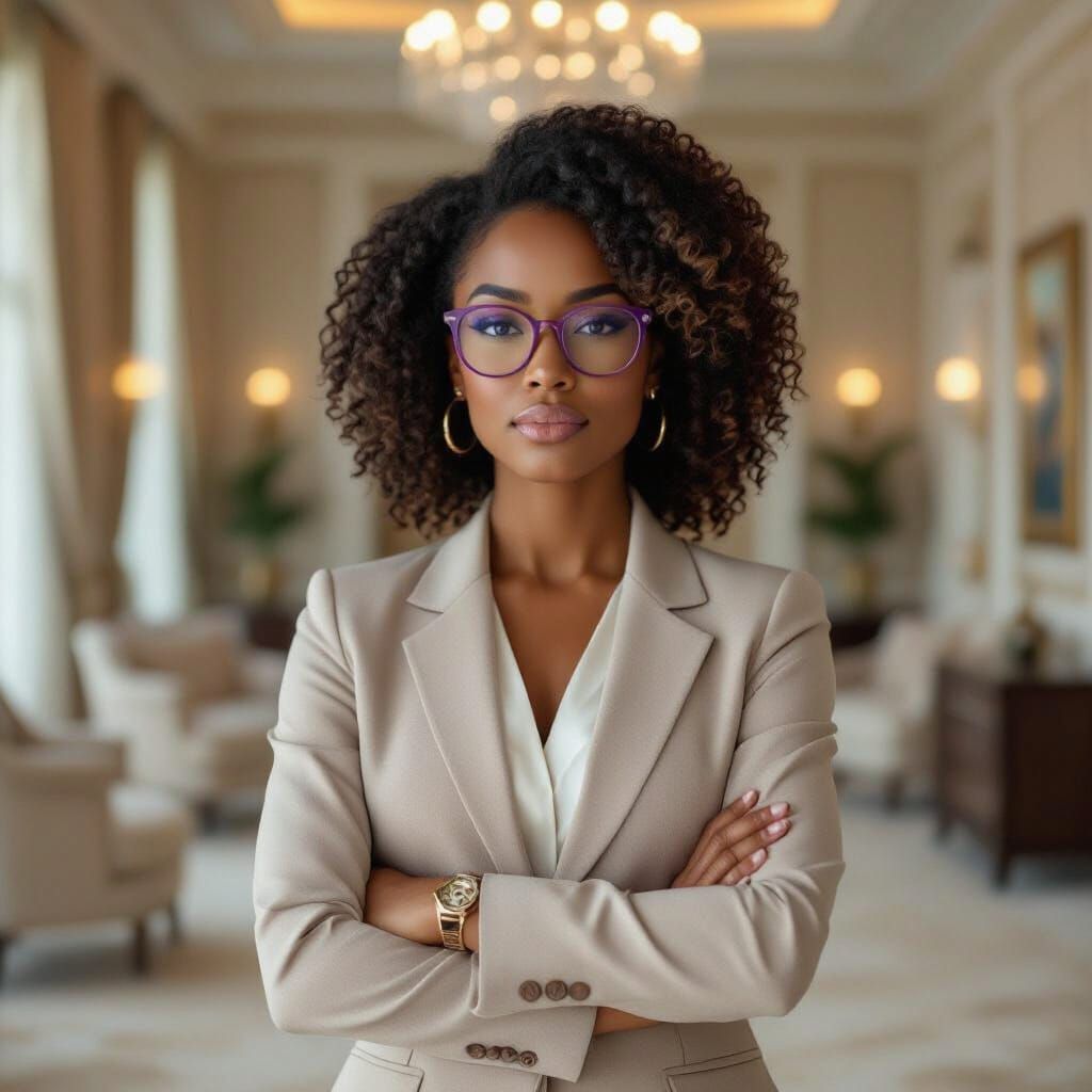 This image shows a stylish Black woman in a professional setting. She is dressed in smart business attire, standing confidently in an opulent office with a serious expression, captured with hyperrealistic detail and muted colors.