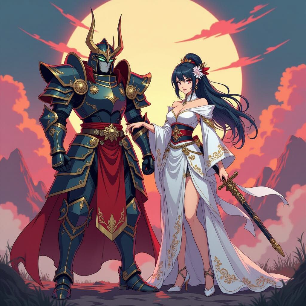 This image depicts a heavily armored warlord standing beside a Peacebringer in flowing robes. The scene is presented with bold lines and vibrant colors in a Japanese manga style.