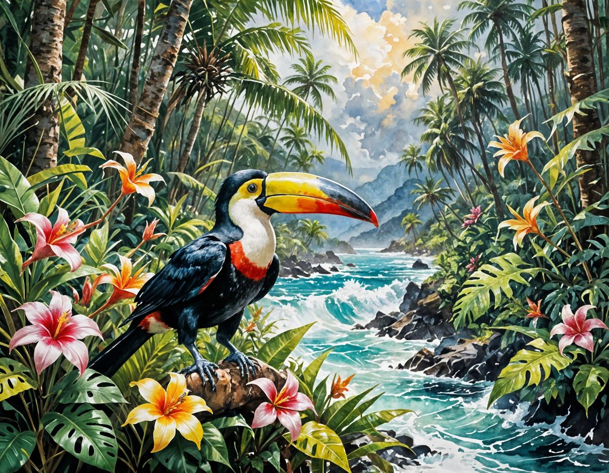 This image depicts a lush tropical forest scene with a majestic tucan amidst exotic flowers, set against a backdrop of turbulent ocean storms and crashing tides, rendered in a unique watercolour and metallic ink style.