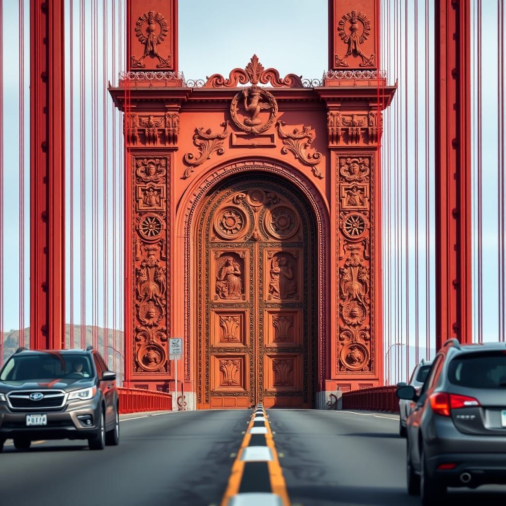 This image shows a highly detailed, ornately carved wooden door incongruously placed in the middle of the Golden Gate Bridge roadway.