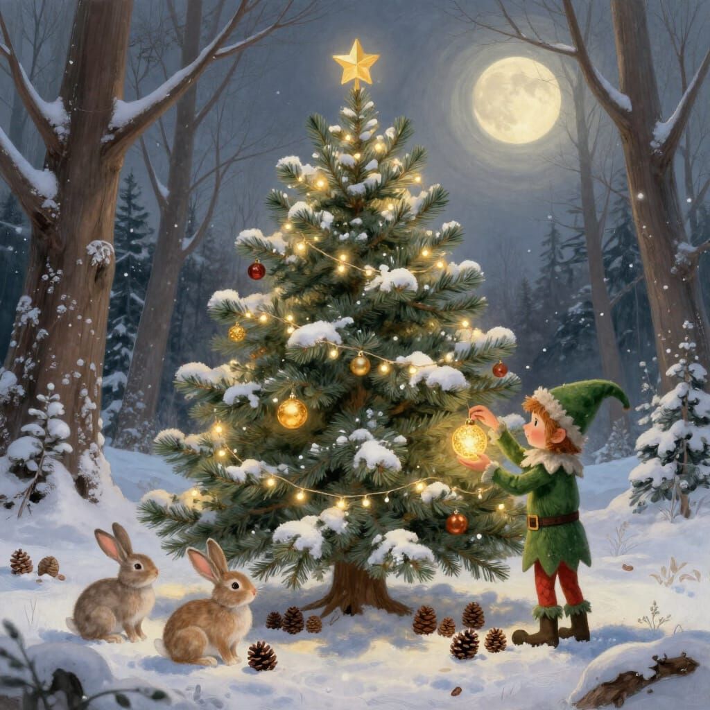 This image showcases a beautifully decorated Christmas tree in a snowy forest, surrounded by rabbits and a friendly elf. Illuminated by fairy lights and moonlight, it's rendered in a detailed, whimsical digital painting style.