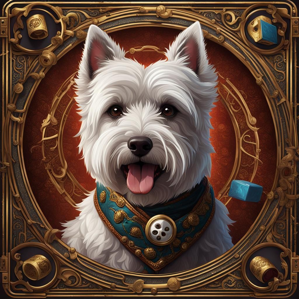 This image shows a West Highland White Terrier enjoying a card game. The dog is smoking a cigar, blowing smoke rings in a richly detailed, colorful fantasy scene, as a digital painting.