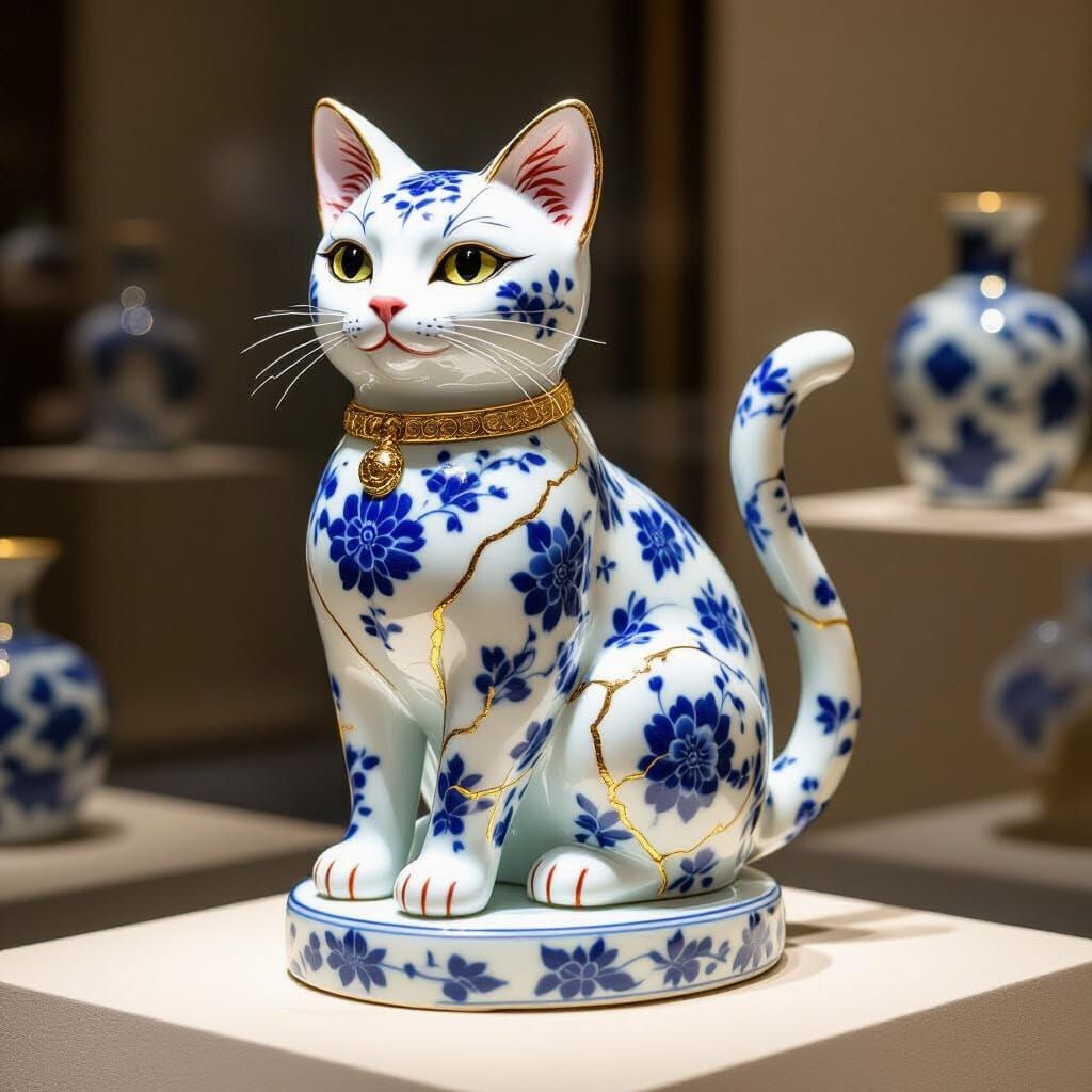 This image shows a porcelain cat figurine with blue floral designs, repaired using the Kintsugi method. Gold seams highlight the cracks in this softly lit, museum-style display.