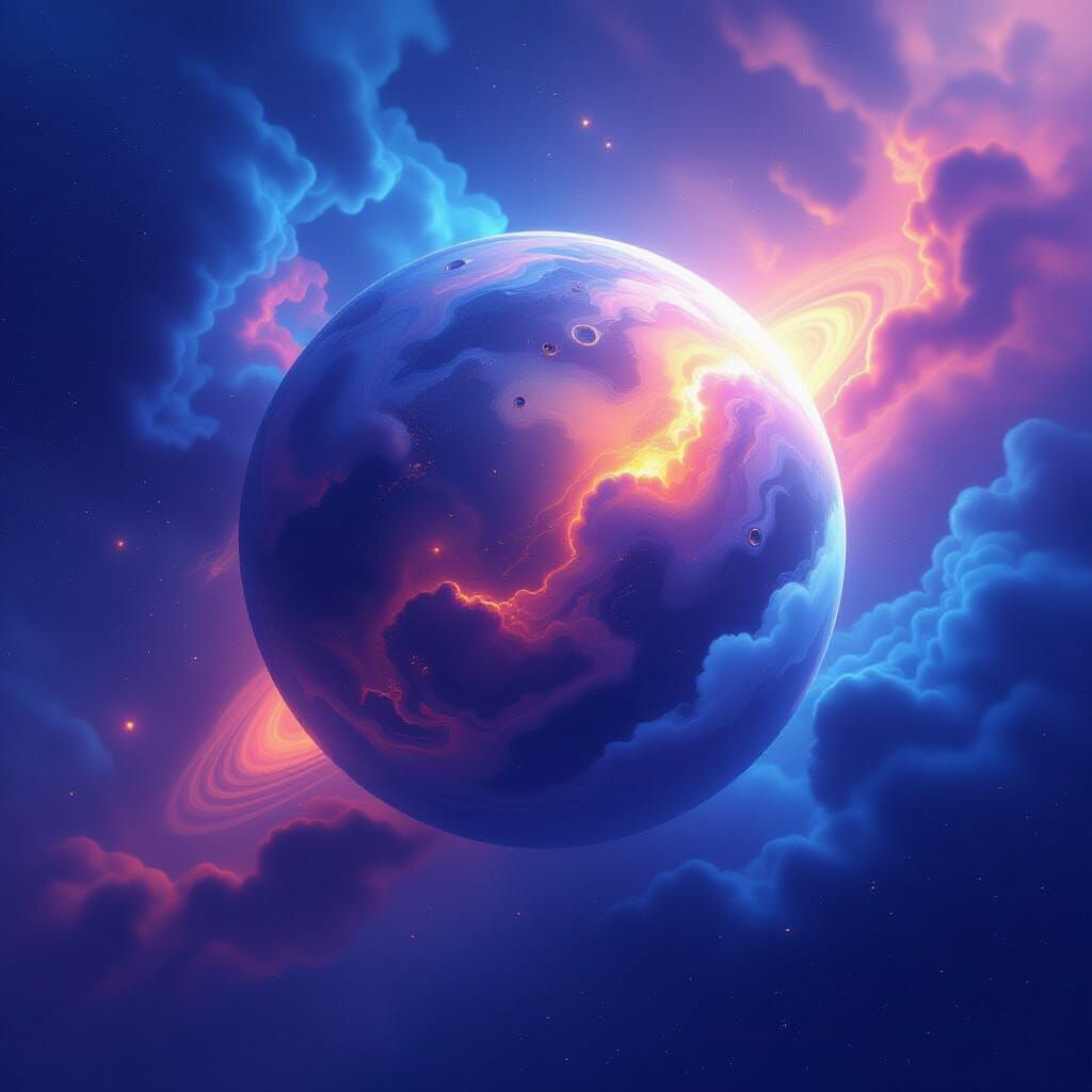 This image shows the planet Mercury with swirling cosmic clouds and nebulae in vibrant blues and purples, in a dreamy, ethereal digital art style.