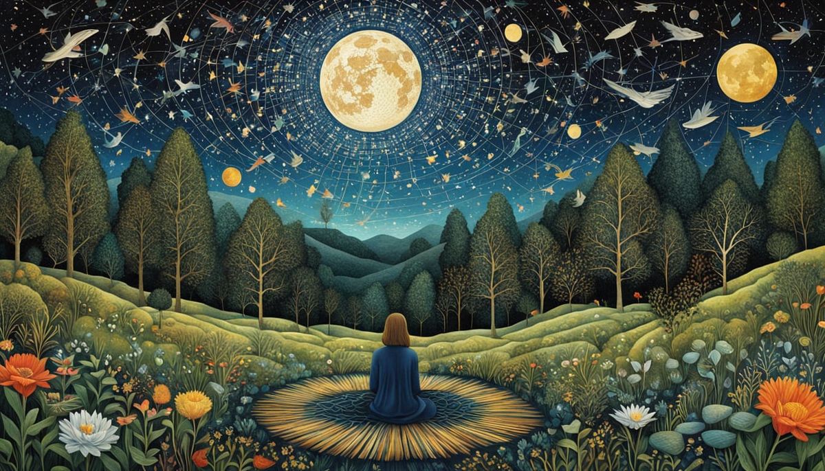 This image is a captivating digital artwork featuring a central figure amidst a rich tapestry of nature scenes, abstract designs, and intricate patterns, symbolizing strength, resilience, and the pursuit of authenticity in a chaotic world.