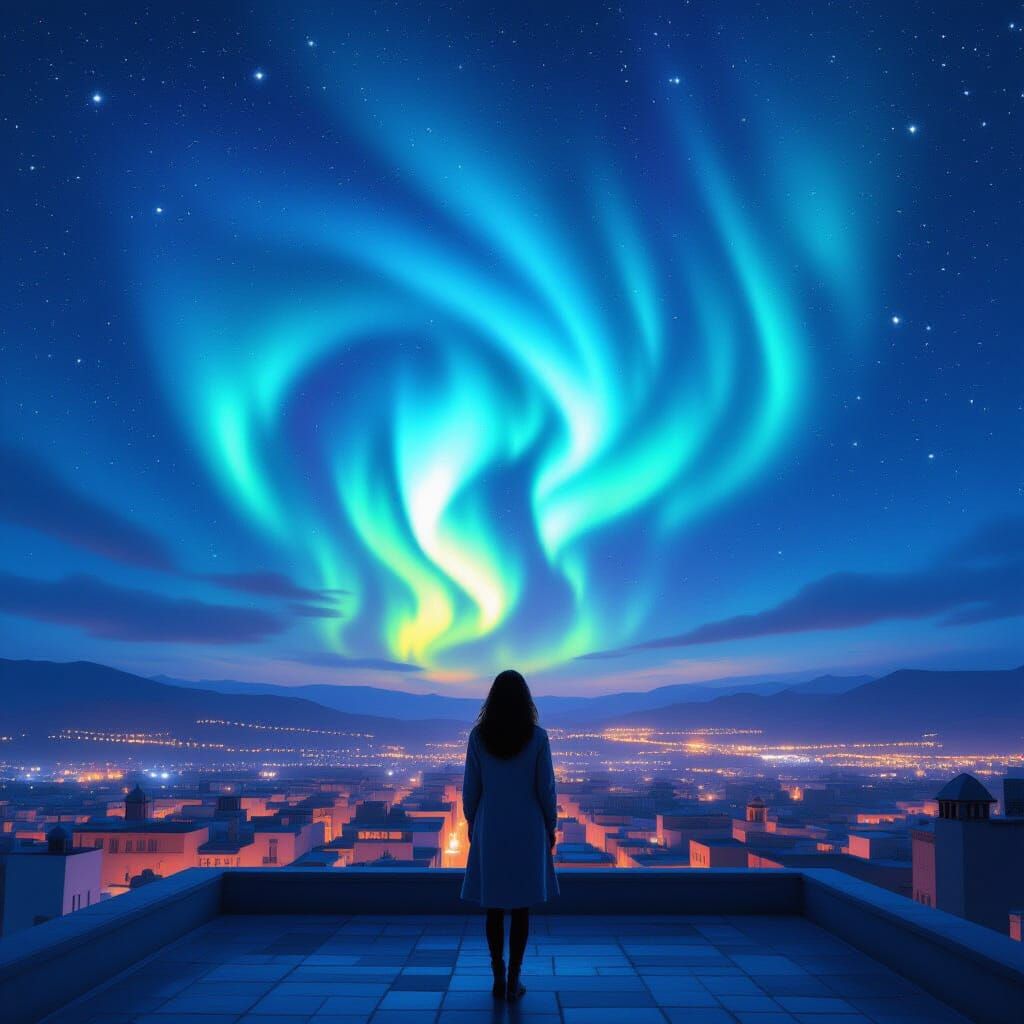 A striking picture of a woman viewing the aurora borealis from a Moroccan rooftop. The city lights twinkle below, contrasting with the cosmic display above. This image is styled as vibrant splash art.